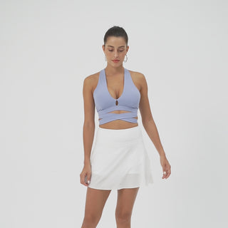 • Cross-back wraparound design with adjustable lace tie for a customised fit