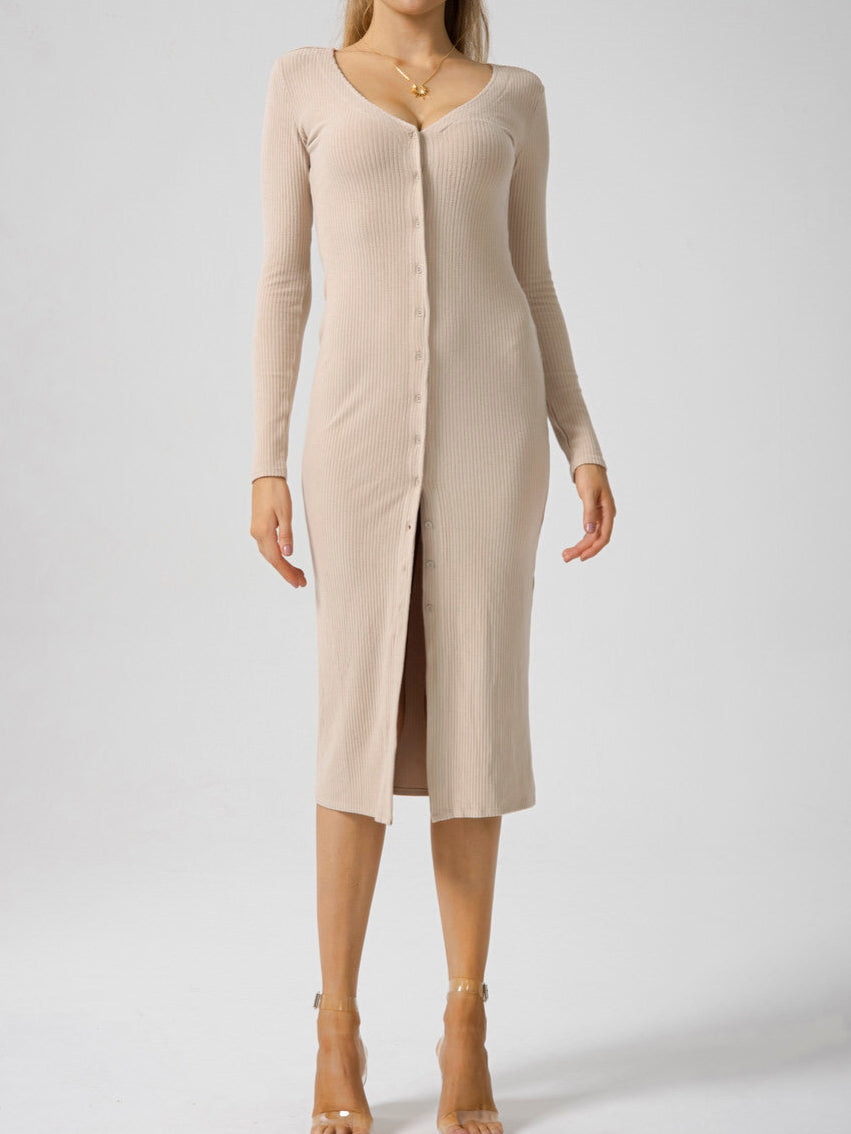 Step into timeless elegance with the XO Open Button V Neck Dress, a sophisticated staple with a modern edge. Featuring a deep V neckline and an adjustable button-front design, this dress blends classic tailoring with contemporary allure. The sleek silhouette is finished with a daring thigh-high slit, striking the perfect balance between refined chic and effortless confidence.